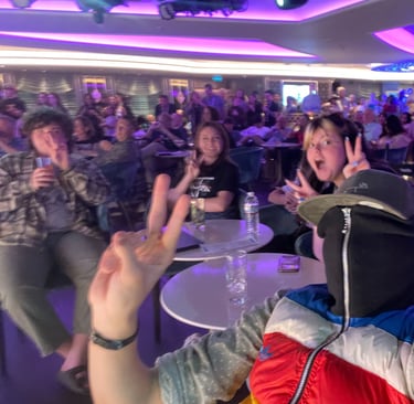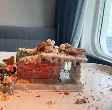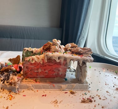 One element à propos music that I loathed was that I, the annoying piano noodler could not get to play on any of the 5 pianos, nor had they any instruments for us to fiddle on, unfortunately. The only instrument that I could practice was for certain, my voice in Karaoke. That was lots of fun, and the staff were entertaining, and maybe a wee bit outrageous. The entertainment crew were excellent, especially the hot cruise director, Cole… He was hilarious; they were all for sure, but he was great. That’s a good thing, especially in the age of social media, and moderation for the sake of blue-haired woke women and Karens. The gingerbread house-making competition (in which I egotistically believed that I’d win triumphantly) was entertaining and engaging. I attempted to recreate the iconic Barcelona Pavilion by Mies Van Der Rohe in Gingerbread, and the roof caved in. I turned it into a massacre, as a statement piece. The most creative, certainly, although, it was the most horrendous. Emphasis cannot be elevated enough when discussing the ship’s crew; they were excellent. Engaging, kind, and always there to assist and care. How do they have such high tolerance and empathy? I guess I’ll never know.