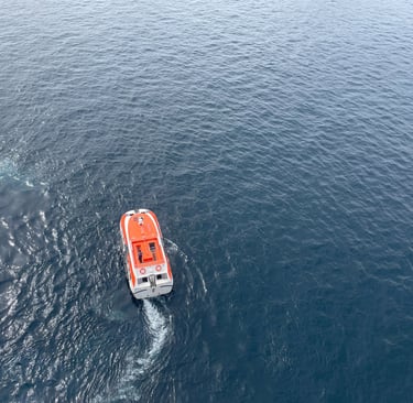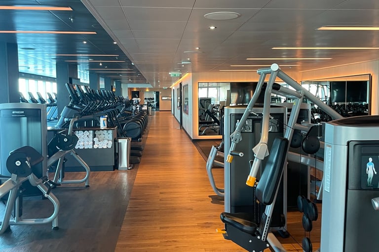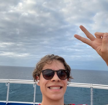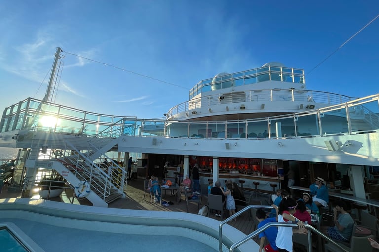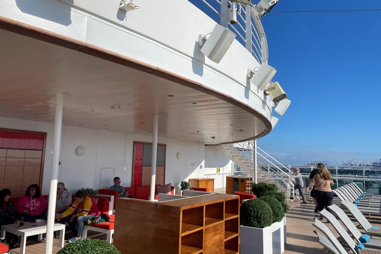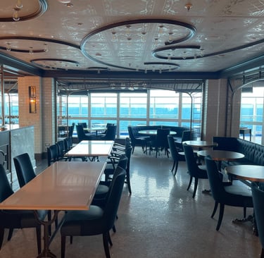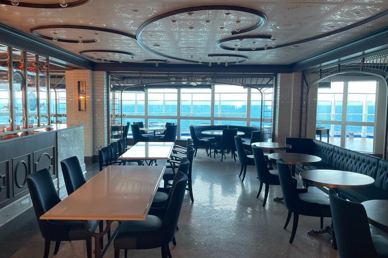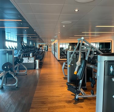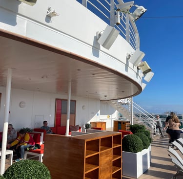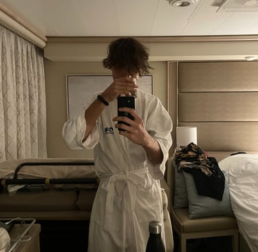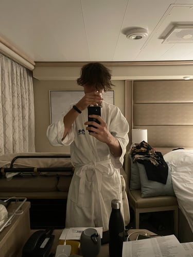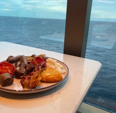 The room I stayed in was on the pleb deck of 8, or as it is more respectively known aboard, the Emerald Deck. Luckily, the deck was not verdant like emeralds, as that would make my seasickness augment !8. Because I shared the room with my two first cousins, once removed, we had 2 twin beds, and a Chesterfield loveseat that converted into a bed. The sleeping accommodations were comfortable, although, nothing to either complain or praise. There was a segmented split-level desk housing a drawer with a hairdryer (as the awful washroom did not have outlets), a mini-fridge (without concert-priced goods inside, and an abundance of outlets, including 2x 120V NA sockets, and 3 euro/international outlets, with lots of holes for pins (that unfortunately did not accommodate the North American ones). USB ports, not USB-C malheureuxement, lay below every nightstand’s lamp. A nice 4k LG TV, snake leatherette headboard, composite wall panels, and fabric herringbone rugging appointed the room. Flanking both Port and Starboard of the room lay the Balcony and washroom. Commencing with the positives, the balcony. As it was conservative in space, the space to lounge was more than conservative; it was socialist, meaning it felt larger than it was. The ocean aided in this illusion, making it feel more grandiose with the blinders separating you from your neighbours.